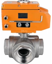 Кран шаровой DN.ru BV3232P(4pc)-SP-3WT-T-ISO-H Ду20 Ру63 стандартнопроходной T-тип, трехходовой, нержавеющая сталь, внутренняя резьба, уплотнение - PTFE, с эл. приводом DN.ru E34-N-005EM-O1-220VAC-У1