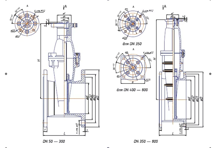 Клиновая задвижка ABRA A40 с голым штоком под установку привода или редуктора на фланец стандарта ISO 5210 или ISO 5211 в наличии с ДУ 40 по Ду 600.
