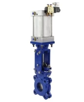 Задвижка шиберная ножевая DN.ru GVKR1331E-2W-Fb-2P Ду80 Ру10 двусторонняя, межфланцевая, клин - однодисковый, шпиндель - выдвижной, корпус - чугун, уплотнение - EPDM, с пневмоприводом и пневмораспределителем 4V210-08 220В KUOIN Казань